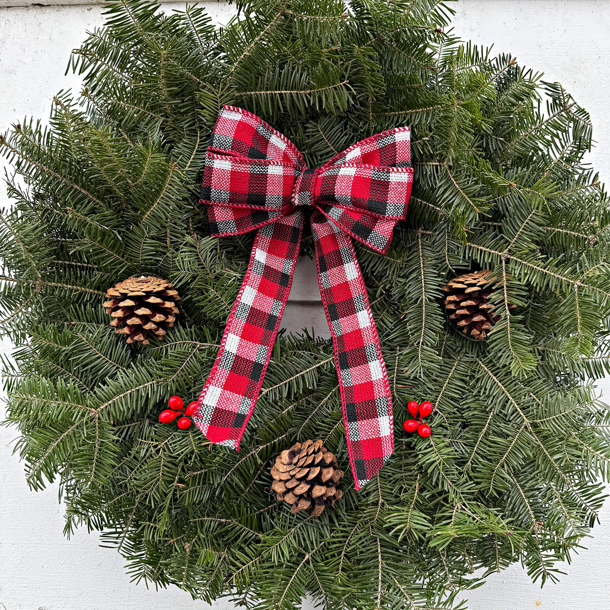 NEW FOR 2025 Launching our 18" Homestead Christmas Plaid balsam fir wreath. Handmade at our family farm in northern Minnesota. This wreath has a wholesome, down-home ambiance and makes a really nice gift. Qty. 1 Handmade in Minnesota