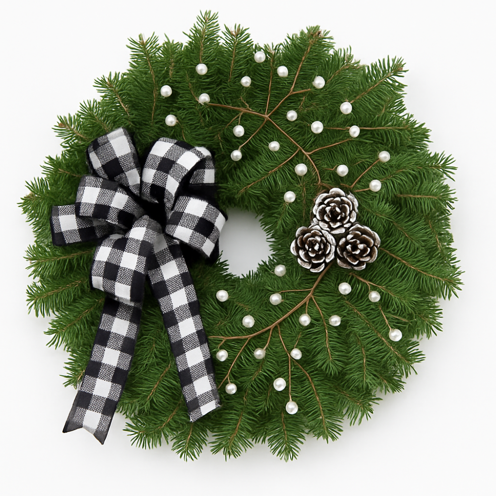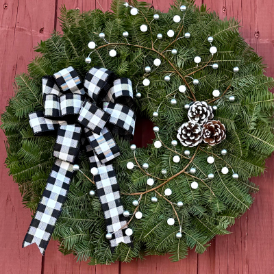 IT'S BACK AGAIN, AFTER POPULAR DEMAND!! Updated for 2025!! This wreath will add farmhouse flair to your holiday decorations. This is a single-sided balsam fir wreath and built on a sturdy metal clamp frame. It has a hand-tied fringed buffalo white and black plaid poof bow, white and silver faux berry sticks and white-tipped pinecones. Product Features