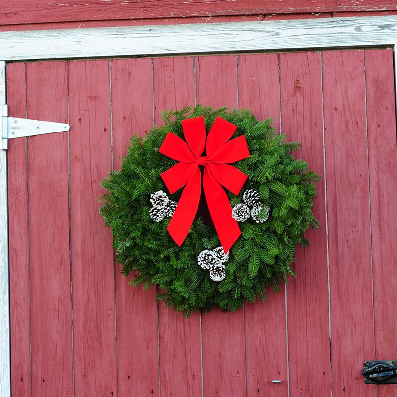 This Contemporary Fresh Minnesota Balsam Pine Wreath Comes With 3 Clusters of Frosted Ponderosa Pinecones and Handmade 6-loop Contemporary Red Velvet Bow. Take a small step away from the traditional wreath look with the contemporary bow. Shipping to the lower 48 states is included in this price. We DO NOT ship to Alaska, Hawaii, or to ANY PO Boxes. We MUST have a STREET address. Please call or text our office with questions regarding shipping at 218-259-9515. Weight: About 4 Pounds Diameter: 24" (can vary up to 2") Qty. 1 Made in Minnesota