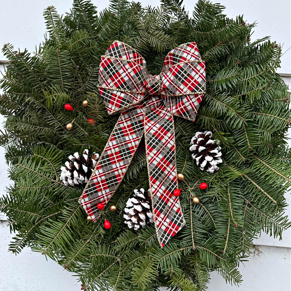 NEW FOR 2025! GIFT OF THE DUCHESS Fresh Balsam Fir Christmas Wreath - Handmade on our farm in rural Northern MN. This ribbon was voted as a favorite in our online poll. Offering more 18" sized wreaths with an affordable price tag is our goal. This wreath takes a giant leap forward to make that happen. Gift this for Christmas or order one for your own enjoyment. Size" 18" Diameter (+ or - 2" variance) | Weight: Approx 2 Pounds