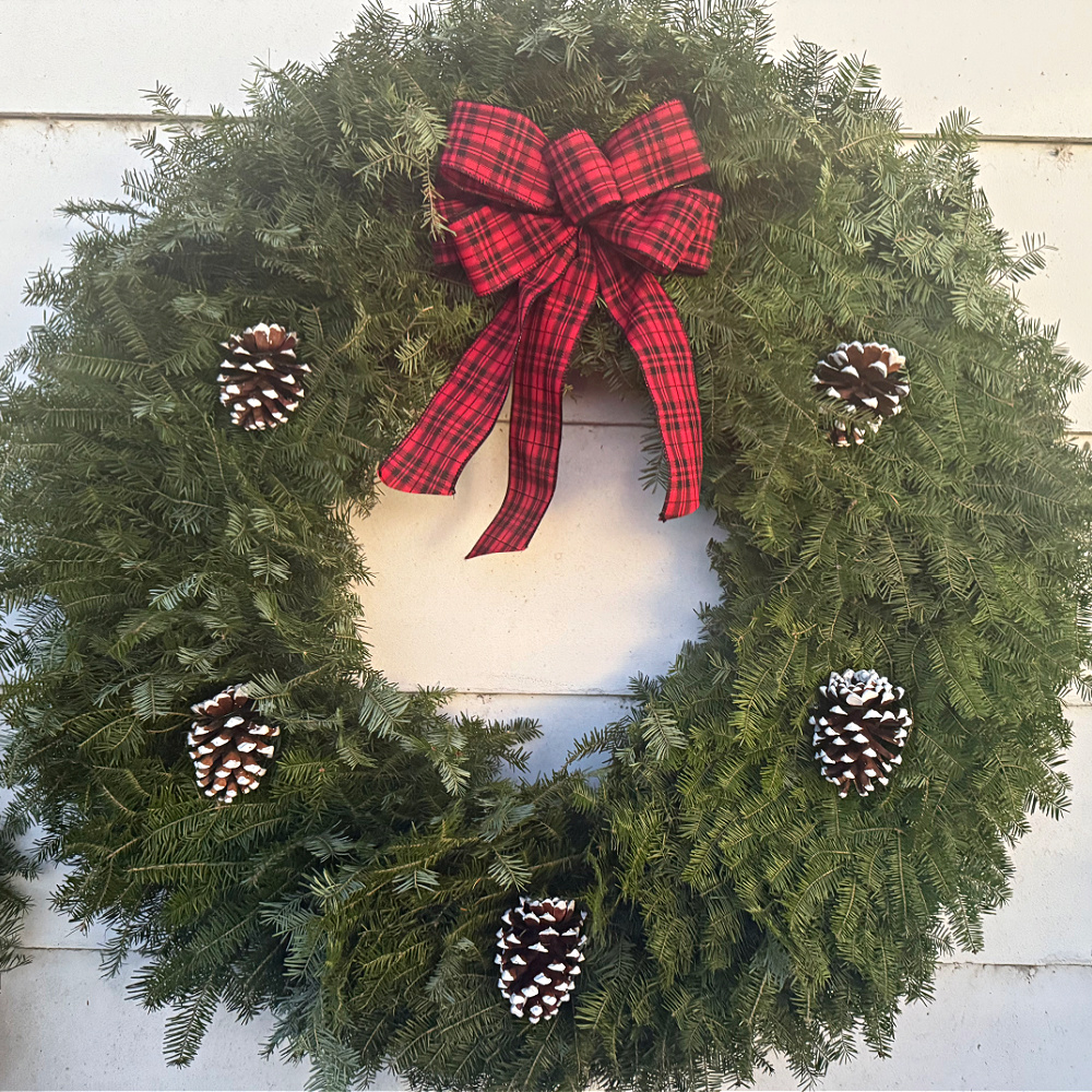 NEW FOR 2025!! Everyone loves a big wreath to hang above the fireplace, barns, sheds, outbuildings, and large walls. The 36" wreath ships with some oversized freight (INCLUDED IN THIS PRICE) to anywhere in the lower 48 states. The red-and-black buffalo plaid bow accents the wreath nicely, along with some natural ponderosa or Austrian pinecones. Upgrading to Mixed Greens is also available if you want more diversity in evergreens beyond the balsam fir.